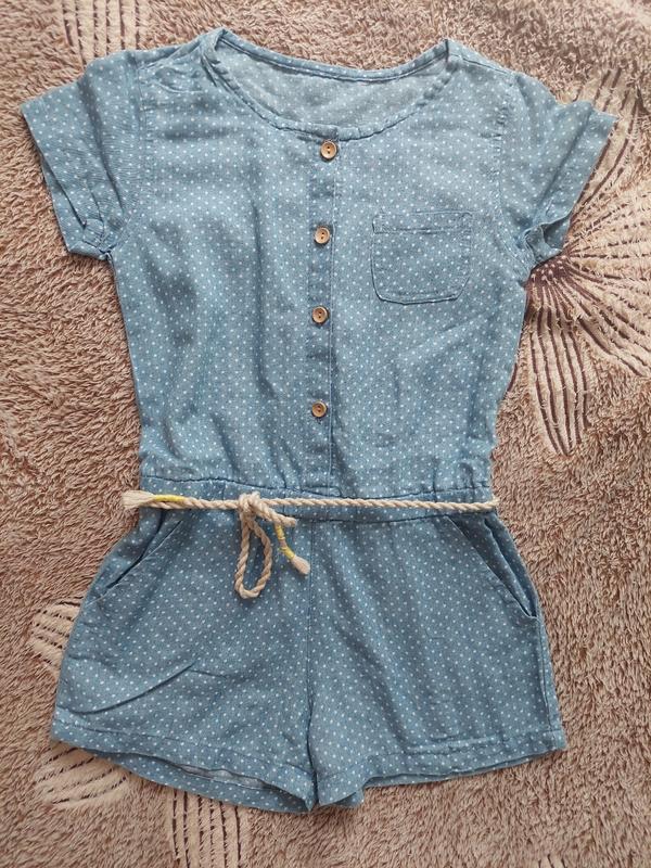 літній комбфнезон з кишенями, блакитний в білий горошок. дуже гарто сидить на дитинці. дов. всього комбінезона-56-57см