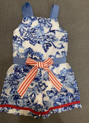 Шикарнючий, оригінальний, стильний, іспанська комбінезон на вік 5 років. Фірма Gaialuna. Комбінезон зроблений шортами, брательник зроблені з гумки, всередині підкладка, зверху подобу сітки, бант знімається. Якість супер, дефектів немає