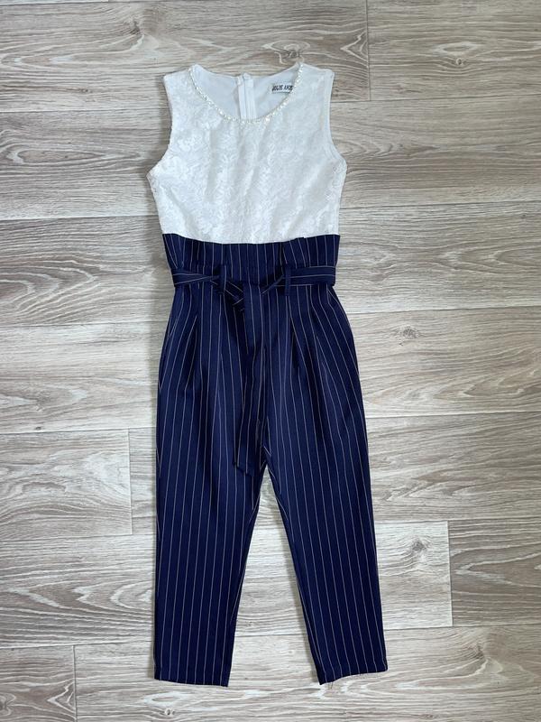 Стильный комбинезон с украшением Верх гипюр на подкладке На талии пояс У шеи украшение из кристаллов Застёгивается сзади на змейке Состояние идеальное без дефектов/как новое 🏷Jolie Angel 8 лет, но смотрите замеры Длина 97(28)/ 57 до паха. Шаг 46. ПОГ 33.