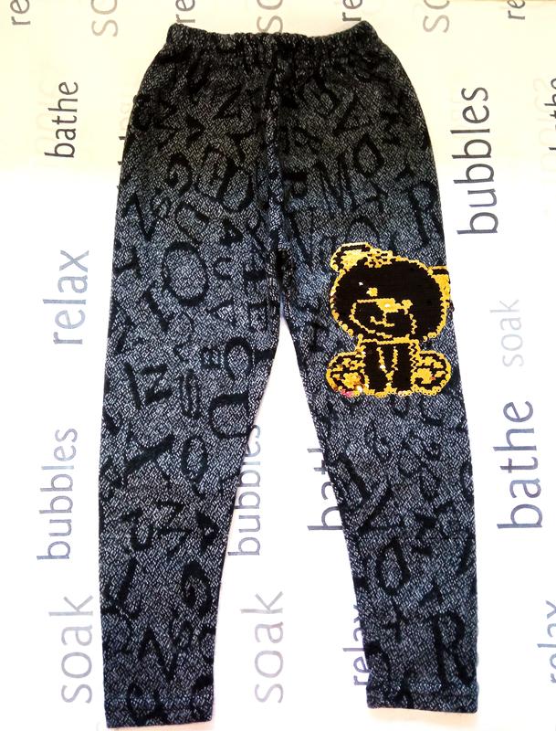 Трикотажні лосини з паєтками, які перевертаються. Без утеплювача. Виробництво Туреччина. 100% котон. Тканина еластична, тягнеться. В наявності: 2 шт. 4-5 років довжина-60 см. крок - 41 см. резинка напівобхват -21 см.