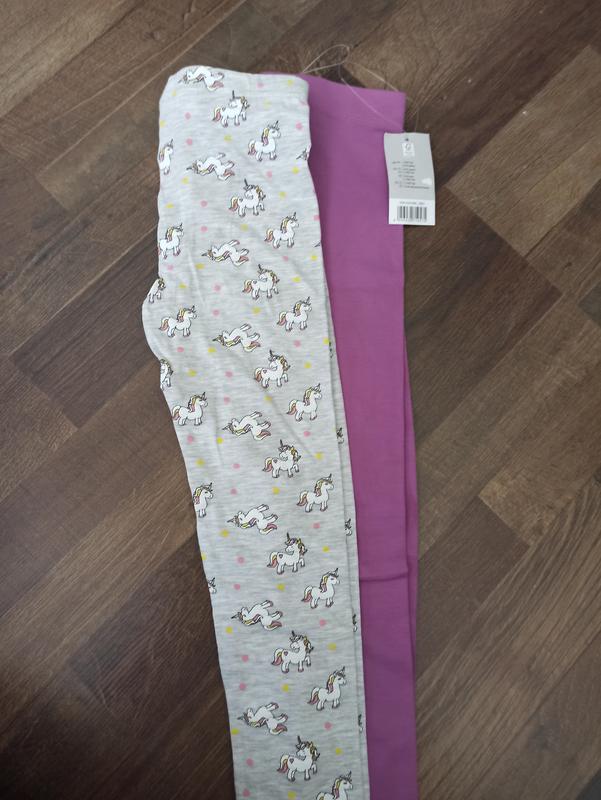 Нові бавовняні лосинки. Фіолетові на сірі меланжеві з яскравими єдиноріжками. Ширина по талії 24,5 см, довжина 58 фіолетових, сірих 60 см. Ціна вказана за набір, можна й окремо.