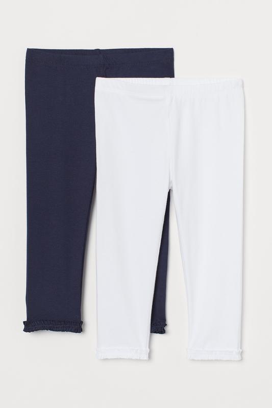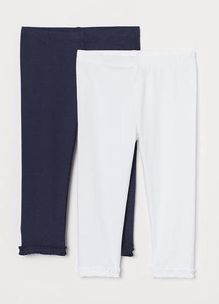 Новые укороченные леггинсы H&M, оригинал с официального сайта (Англия), упаковка из 2-х шт., можно и одни. Длина 3/4 ножки. Есть два размера: 6-7 лет (на рост 122 см), 9-10 лет (на рост 140 см). Цвета - белый и темно-синий. Состав: 95% органический хлопок, 5% эластан. Мягкий летний трикотаж. Хорошо тянутся. В поясе широка резинка. Низ отделан рюшечкой. Качество отличное. Произведены в Индии. Цена за одни - 180 грн. Замеры размера 6-7 лет: белые: длина - 51 см, ширина по поясу - 26 см, шаговый шов - 33 см; синие: длина - 49 см, ширина по поясу - 26,5 см, шаговый шов - 32 см. Замеры размера 9-10 лет: белые: длина - 56 см, ширина по поясу - 28,5 см, шаговый шов - 37 см; синие: длина - 56 см, ширина по поясу - 28,5 см, шаговый шов - 37 см.