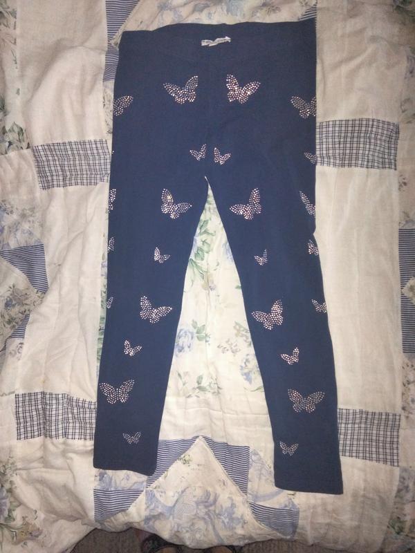 Качественные лосины от бренда Bluezoo. Идеальное состояние. Состав ткани: хлопок, эластан. Возраст указан 8-9 лет, но реально подходит на 7-8; на рост до 130 см. Талия на резинке, в не растянутом состоянии 29.5 см. Длина брюк по внешнему шву 67 см, длина по внутреннему шву 53 см. Расстояние от талии до шва между ног спереди 17 см, расстояние от талии до шва между ног сзади 20 см. Цвет тёмно-синий. Бабочки из мелких страз хорошо держатся. Смотрите и другие мои объявления. Широкий ассортимент кожаной фирменной обуви для всей семьи. Пересылаю НП и укр почтой