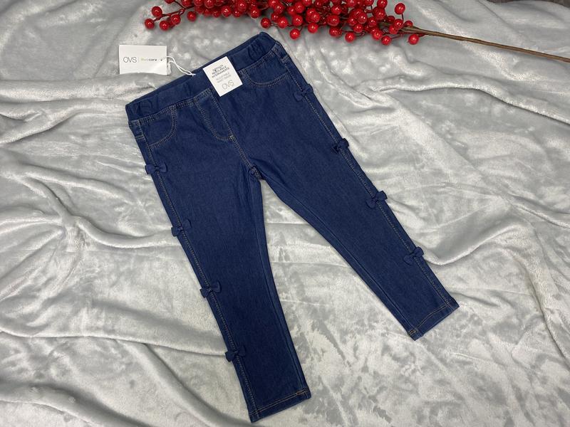 Продам стильні джегінси для дівчинки, по бокам оздоблені бантиками. Довжина - 51см, полуобхват талії - 23,5см, полуобхват стегон - 28см, шаговий - 35см.