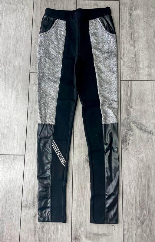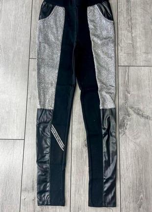 Теплые лосины леггинсы на тоненьком флисе Тканина стрейч сверху вставки из блесток и эко-кожи размер 176 маломерит будет на 152-164 Замеры: пот 29-50 длина 90 крок 64