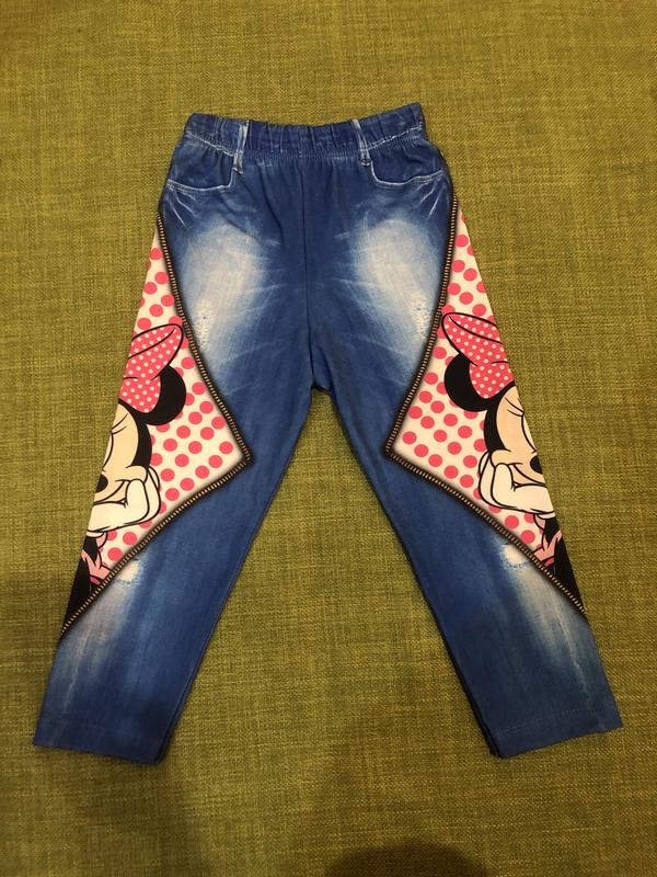 Лосины на девочку Расцветка под джинс; нарисованные карманы (имитация) спереди и сзади; с рисунком Минни Мауса по бокам В наличии 4 шт разного размера: Замеры: длина 42,5/ 44/ 46,5/ 50 см полуобхват бедер 24/ 24/ 26/ 27 см Тканина: бавовна