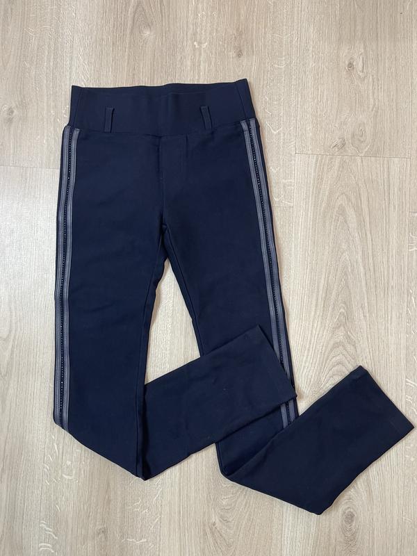 Лосини для дівчинки з лампасами, розмір 158, темно-синій колір, по талії широка прошита резинка, не буде прокручуватись. Склад 67% котон, 28% поліестер, 5% спандекс.