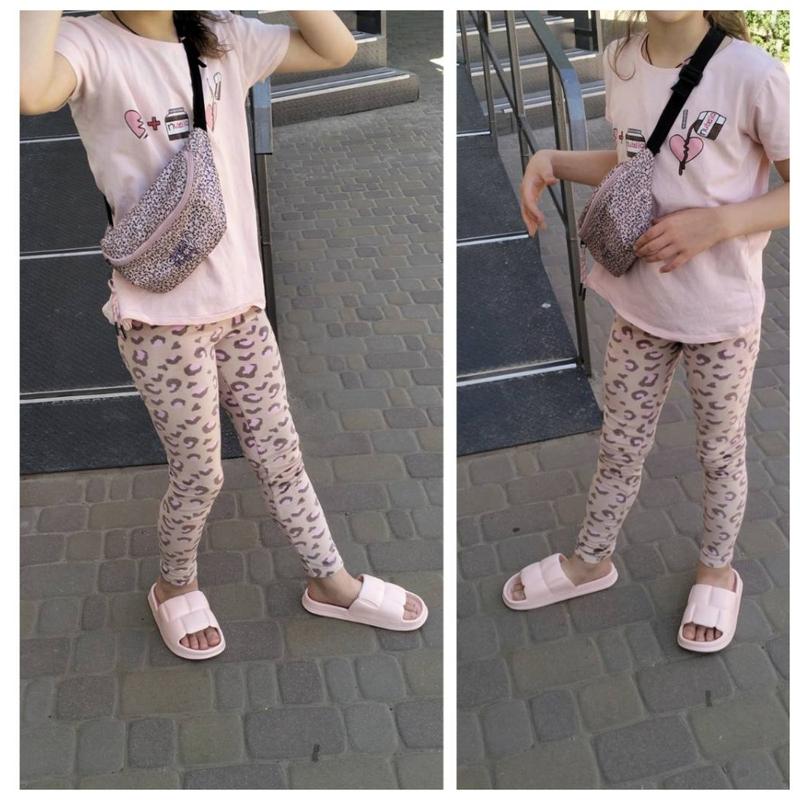 дитячі легінси з леопардовим принтом, доповненим рожевими плямами. .М'яка тканина велюр Недоліки немає зовсім Носили і літом в трохи прохолодну погоду Вони дуже класні