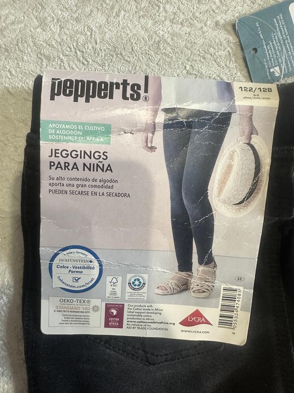 В наличии джеггинсы для девочки от немецкого бренда pepperts, торговый дом Lidl. Материал: 73% хлопок, 22% полиэстер, 5% эластан. Размер 122/128 (6-8 лет): длина 66 см, шаговая длина 49 см, ширина по поясу 26,5 см. Моделька к низу зауженная, как лосины. Цвет черный, темно-серый