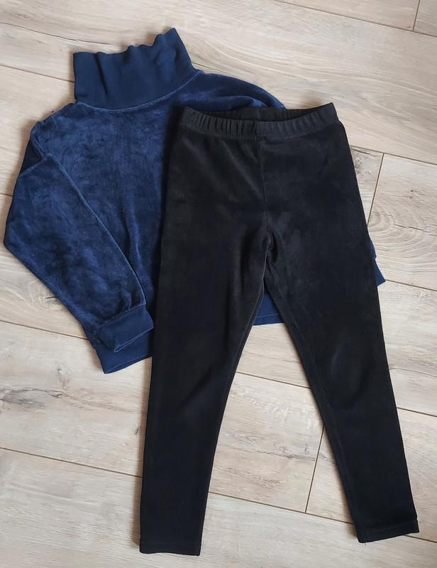 Тканина велюр Гольф немного с спущенным рукавом Лосины утеплены флисом Состояние очень хорошее почти новое Кофта длина- 40см Рукав от горловины- 46см Полу обхват груди-40см Брюки длина- 68см Полу обхват пояс-26см Полу обхват бедер- 36см