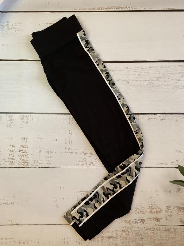 Классные черные лосины с лампасами камуфляжного цвета. Плотный широкий эластичный пояс. Щільні. Отлично тянутся. Могут подойти как на указанный рост, так и на размер-два больше. Хорошо ложатся по фигуре. По наборке размер 152 см. Primark, Испания 🇪🇸