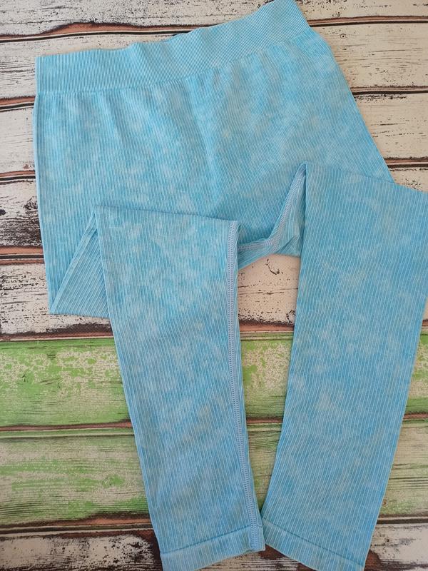 В стилі Тай Дай Дуже красивого блакитного кольору Хороша еластичність З внутрішньої сторони лосин розмір вказаний L, на ярличку зі складом тканини вказаний вік 11-12 років 95% нейлон 5% еластан Довжина 72, тягнеться у довжину також Довжина крокового шва 49 Пів окружність талії 29 резинка легко тягнеться до 40 Пів окружність стегон 36 легко тягнеться до 54 Посадка 24