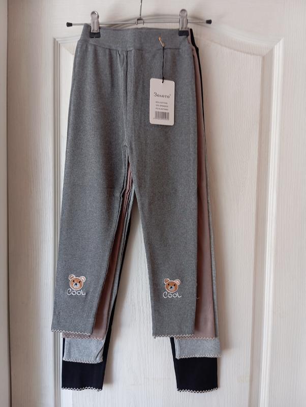 Лосины в рубчик с вышитым медведиком, хороший состав ткани: 85% коттон, 10% спандекс, 5% эластан. Не кашлатятся и не вытягиваются в коленях, давно продаем их товар и среди недорогого сигмента - они делают качественные вещи. ЗАМЕРЫ длина 64 см, по шагу 41 см, пот 23 см (серого цвета), длина 65 см, по шагу 42 см (капучино), длина 70 см, по шагу 45 см 23,5 см (серый меланж), длина 79, по шагу 52 см.(черные)