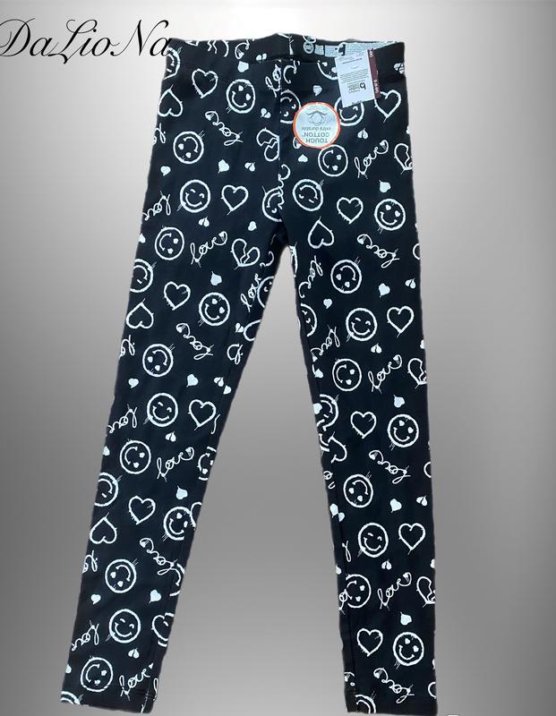 ❤️❤️РОЗПРОДАЖ❤️❤️ На зображенні представлені чорні легінси (без утеплення), Wonder Nation для дівчаток з принтом у вигляді білих смайликів та сердечок. На етикетці зазначено "TOUGH extra durable COTTON", що вказує на підвищену міцність та використання бавовни. Ці легінси є універсальним елементом гардеробу, який підходить для школи, ігор та повсякденного носіння завдяки комфортному бавовняному матеріалу з додаванням спандексу для еластичності. Розмір: S (6 років). Заміри: - довжина пояса: 25 см., тягнеться до: 31 см.; - довжина лосин від пояса: 73 см.