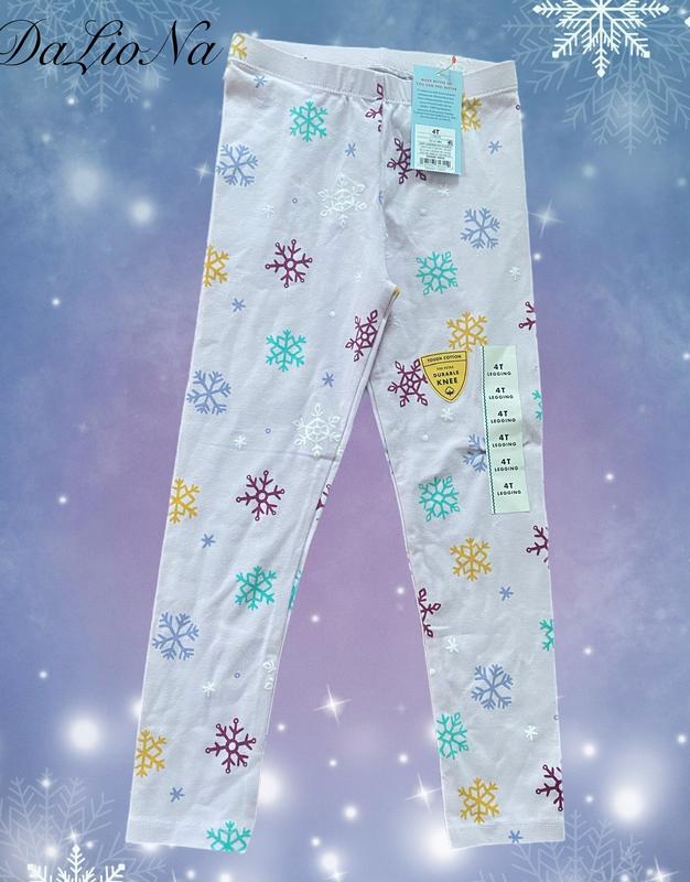 На фото представлені дитячі лосини світлого - рожевого кольору з візерунком у вигляді різнокольорових сніжинок. Сніжинки виконані у відтінках фіолетового, жовтого, бірюзового та бордового кольорів. На лосинах є етикетки, одна з яких вказує розмір "4T LEGGING" та особливість "DURABLE KNEE" (міцні коліна). Тканина: бавовна. Розмір: 4 років. Заміри: - довжина пояса: 23 см., тягнеться до: 29 см.; - довжина лосин від пояса: 58 см.