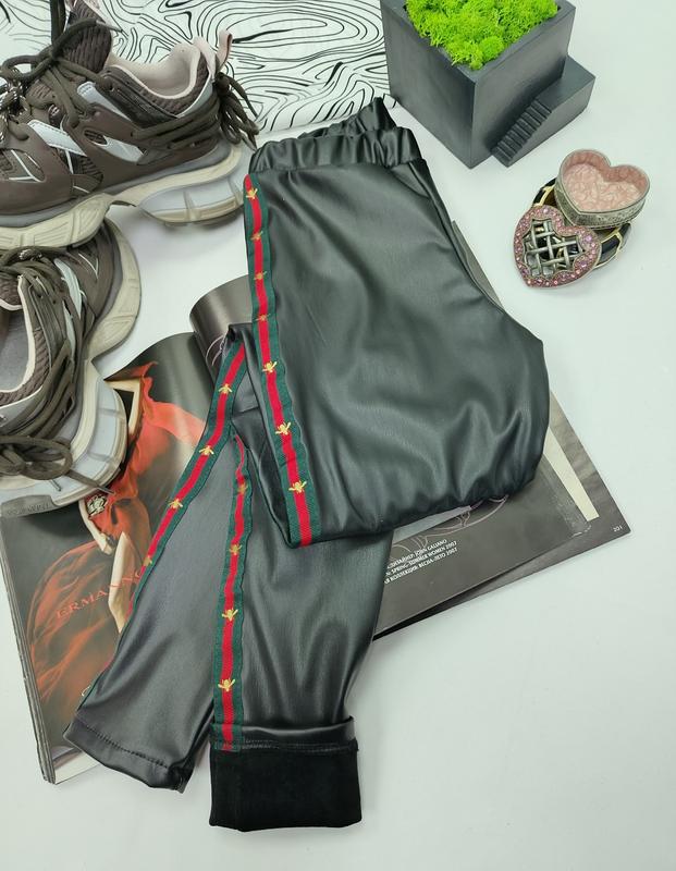 116-134- 550грн 140-164-590грн под заказ 1-5 роб.днев Лосини на флісі з еко шкіри. "Gucci" Классические леггинсы из эко-кожи черного цвета с высокой талией, на флисовой подкладке.Стильные леггинсы идеально подчеркнут образ девушек. Плотные и очень комфортные. Без карманов. высокая посадка. Украшены лампасом Замеры +-1-2см( делались в ручную) ЛОСИНИ: Размер/ Длина бокового шва, Шаг( резинка хорошо тянется, животик не передавливает!) 👖116р/70см/50см 👖122р/73см/52см 👖128р/79см/55см 👖134р/ 83см/ 58см- 👖140р/ 86см/ 60см- 👖146р/ 89см/ 63см- 👖152р/ 93см/ 65см- 👖158р- 97см/ 68см 👖164р- 102см/71см