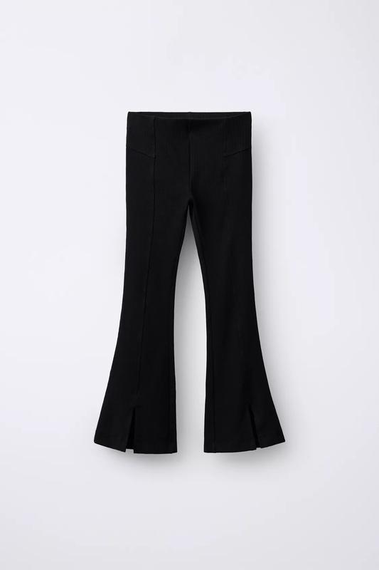 Легінси в рубчик, розкльошені донизу, з еластичним поясом і розрізами внизу. Деталь шва спереду.