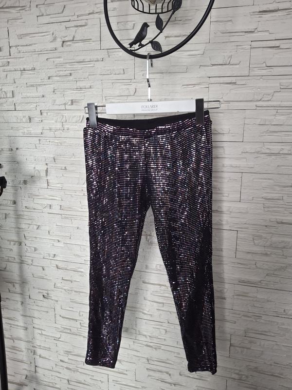 Черные спортивные лосины для тренировок гимнастикой или танцев. Верх в розово-малиновых пайетках. Они крепко держатся. На обороте эластан. Фирменные. Качественные. К телу не кусящие. Эластичность хороша. Выглядят бомбезно. Их можно и на выступы одеть. Состояние отличное. Нюанс рисушечкий. Показано на останньому фото. Там 3 пайетки нет. Носилы не долго, потому что имели много одежды. Рост 140см. В талии 31см. Длина 72см.