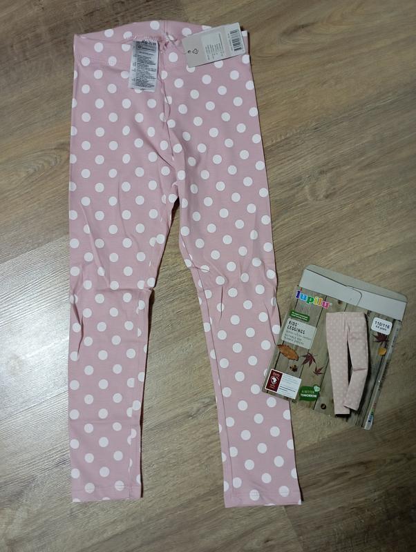 Дитячі хлопкові лосинки на дівчинку від брендового виробника lupilu в рожевому кольорі в білий горох в розмірі 110/116 на 4-6 років. Довжина бокового шва -62см шаговий шов -45см талія по резинці -25см