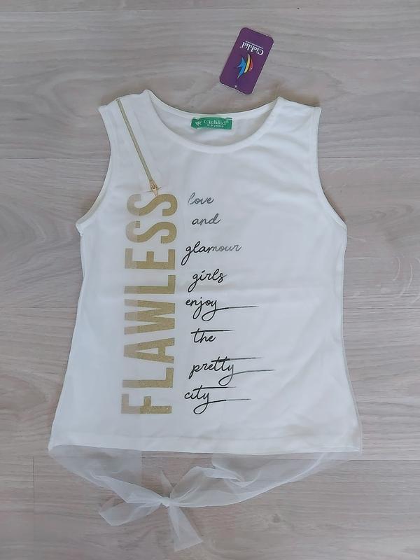 Очень красивая майка молочного цвета с принтом и вставками из фатина. Фатин пришит по бокам и завязывается спереди на бантик. Майка очень удобная и приятная к телу. Можно сочетать с разными стилями. Материал хлопок, фатин. Качество супер. Производитель Турция фирма Cichlid