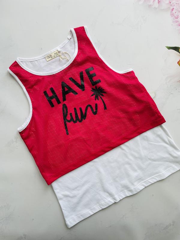 Стильна маєчка надзвичайного дизайну. Основа біла олнотонна у поєднанні з топом із сітки. Йде суцільною майкою. На зріст: 158 см
