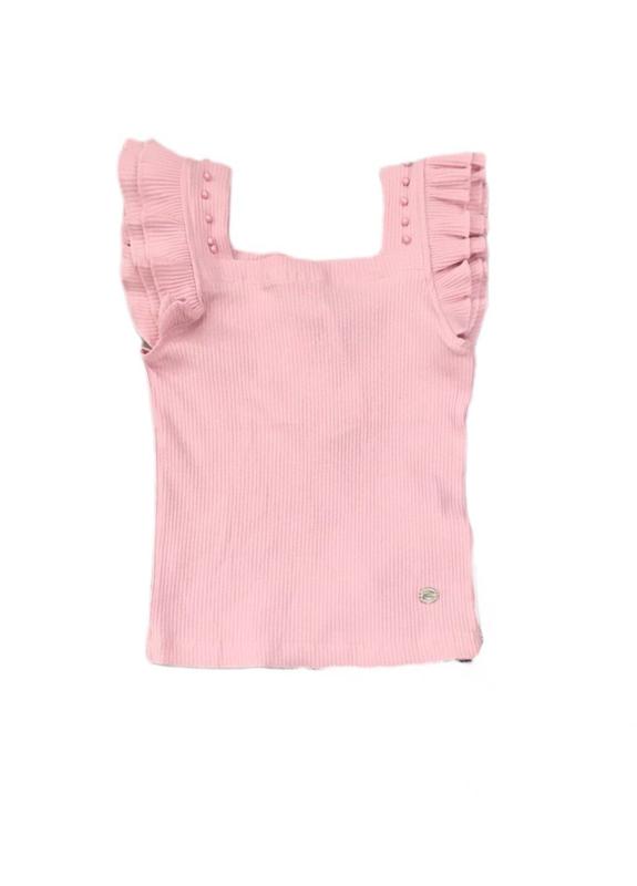 Гарний топ-майка в рубчик для дівчинки з рюшами на бретельках, виглядає дуже оригінально.Виріб в рожевому кольорі.Це чудовий варіант одягу для прогулянок та свята,легко поєднується з іншим гардеробом.