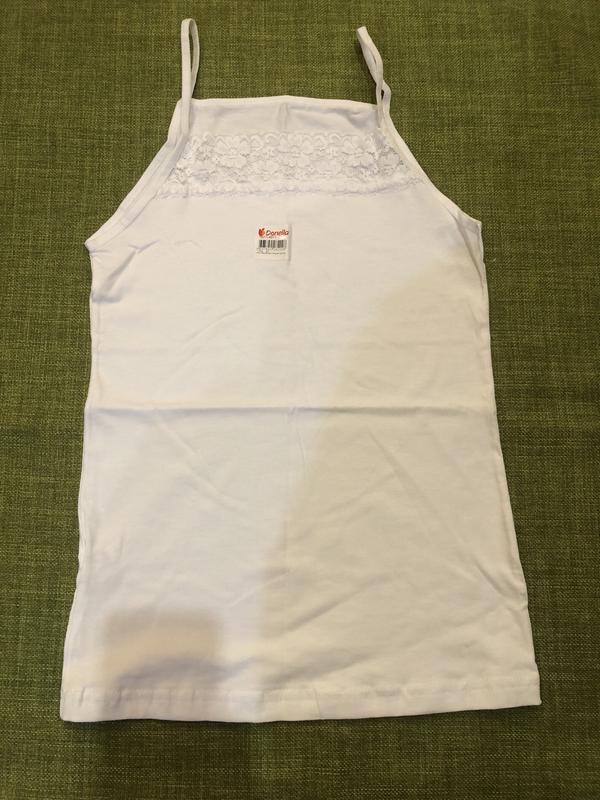 Майка на дівчинку 10/11 років Спереду декорована мереживою вставкою В наявності 4 шт Розмір: 146/152 Заміри не в розтягнутому стані: довжина 58 см півобʼєм по груді 34 см обʼєм пройми 45 см Тканина: 95% бавовна; 5% еластан Колір: білий