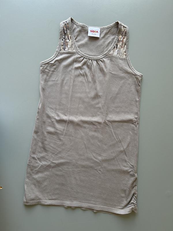 Зручна майка з паєтками на плечах на дівчинку 10-11 років зростом 140-152см. Ціленька, на грудях є ледь помітна плямка (фото не передає). Довжина - 64см Ширина в плечах - 24см Ширина по грудях - 35см Ширина внизу - 40см