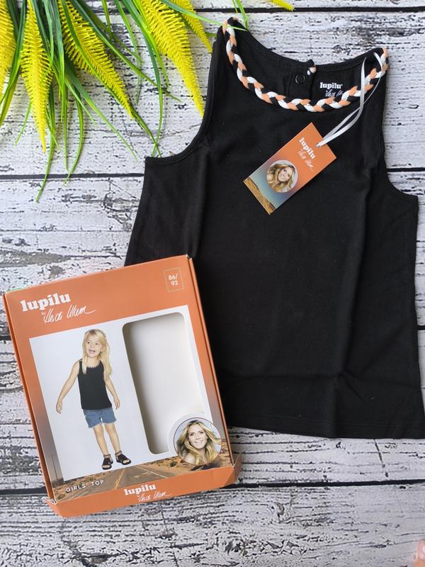 Оригинальная летняя маечка с декоративной отделкой - косичкой 😍 🐌86/92(1-2 рочки, будет немножко дольше) Лупілу, 💯 високоякісна бавовна. В оригинальной фирменной упаковке. Можно на подарок. Очень классно под лосинки, капри или шортики. Мягкая и приятная к телу. Качество- 👍 Лупилу-то ♥️ с первого прикосновения... 🐌86/92 длина 38 пог 27 ширина понизу 34