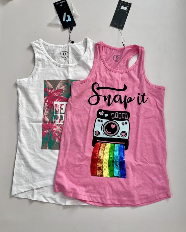 Классные качественные майки девочкам от польской фирмы Reporter Young. Изготовлены из натурального хлопка Немного удлиненные модельки Белая в размере 152 - полная длина от плеча до низа 65 см, (спереди короче), по груди 39 см Розовая в размере 158 - длина от плеча до низа 61 см, по груди 39 см