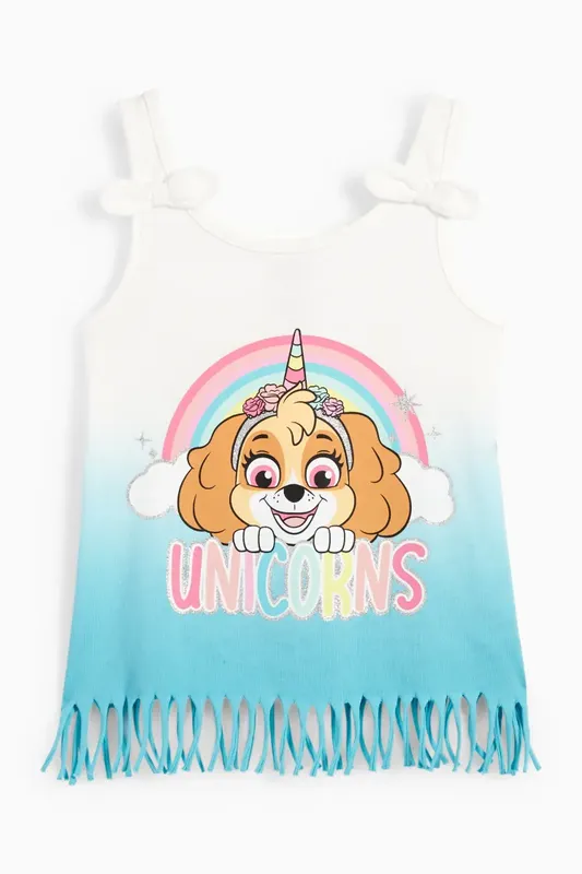Топ з м'якого трикотажу з кольоровою градуюванням. Декоративний бантик на бретелях, блискучий принт Скай і бахрома по подолі. Склад: 100% бавовна. Зріст/розміри: 134cm (9Y). ДОСТАВКА Нова Пошта Укр Пошта Міст Експрес Розетка Самовивіз м. Київ Доставка з післяплатою предоплата 130 грн. Обмін/повернення Фото та відео на запит