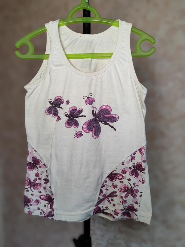 Майка для девочки Состояние: идеальное На возраст: 5-6 лет На рост: 110-116 см Сезон: Весна, осень, зима, лето Материал: 100% хлопок Фирма: Donella Замеры: Длина: 40 см Ширина по груди: 29 см