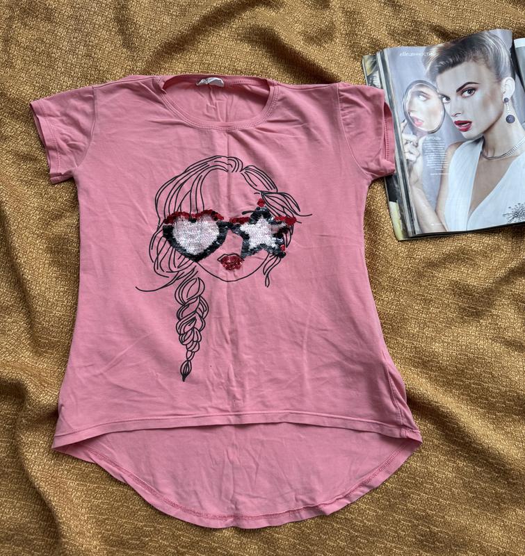 Красивая майка для девочки с пайетками и рисунком/ Подойдет на 8-11 лет/ Тянется,плотность средняя: Маечка с небольшим шлейфом/ Длина 47-57 см/ Плечи 34,5 см/ Рукав 8,5 см/ Пог 39,5 см/ Знизу 45 см/ Продается без возврата/