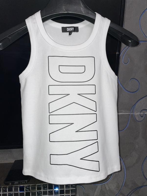 Брендовая майка футболка DKNY оригинал. В хорошем состоянии. Размер по набору 8 лет. Длина 46, пог 31.