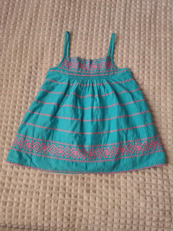 Майка бірюзового кольору з рожевим арнаментом, з переду має резинку під грудьми, по заду 3 гудзика, вільний крій,є бавовняна підклада, дає пишність, розмір 7-8 років, стан ідеальний. Заміри: довжина 47см., ПОГ 30см.