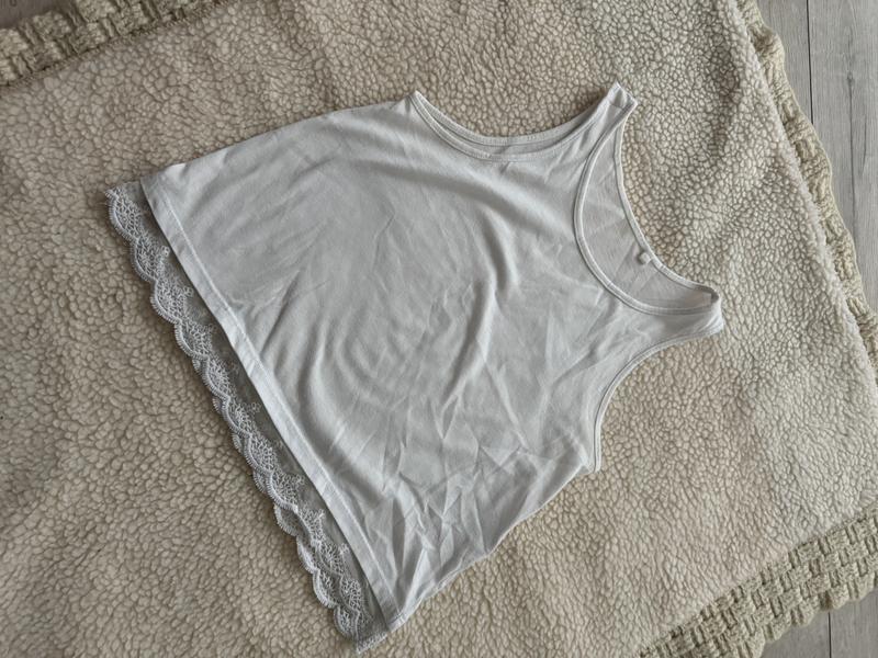 Детская белая маечка с рюшкой/ Тянется,плотность средняя/ Подойдет на 7-11 лет/ Подойдет под одежду или для повседневной носки/ Длина 38-42 см. Плечи 24 см/ Пог 36 см/ Пот 37,5 см/ Знизу 41 см/ Продается без возврата/