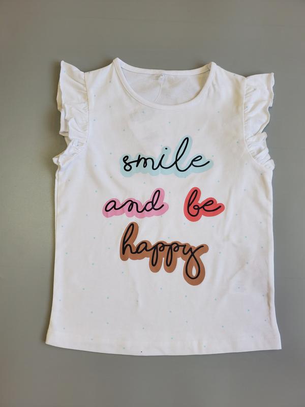 💥ВАЖЛИВО 💥 ☑️«БЕЗПЕЧНА ОПЛАТА»-ТІЛЬКИ « ОПЛАТА ПРОДАВЦЮ НА КАРТУ» ☑️ПЕРЕД ЗАМОВЛЕННЯМИ УТОЧНІТЬ ПРО НАЯВНІСТЬ ТОВАРУ . ☑️ « ROZETKA”-НА ДАННИЙ ЧАС НЕ ВІДПРАВЛЯЮ. Біла майка з яскравим написом "Smile and be happy". Ідеальний вибір для створення гарного настрою! Розмір 104-110 см. на 4-5 роки Ціна-185 грн