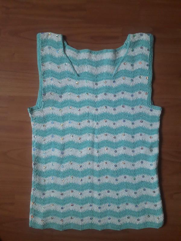 Маечка для девочки на лето, плотно связана крючком из хлопковых нитей, украшена пайетками, в хорошем состоянии. Ширина в груди 34см, длина от плечевого шва 50см. Пришла Укр-почтой или Новой