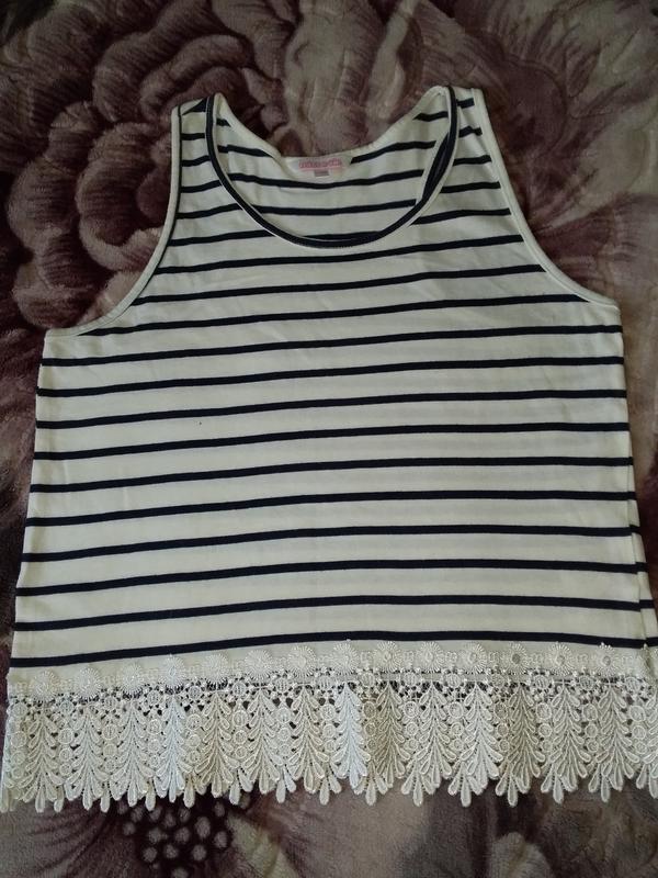 майка короткая, на 11- 12роков, miss e- vie, широкая полоска низ украшен ришелье, 100% коттон, плечи 22см, полуобъем груди, талии 36см. длина 46см.