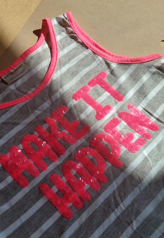 LC Wakiki боди-майечка для девочки 10–11 лет 140–146 см Легкая и удобная вещь. Серый цвет в белую полоску с яркой розовой отделкой. Впереди блестящая надпись MAKE IT HAPPEN из пайеток. Материал мягкий, приятный к телу. Длина изделия: 50 см Полуохват в груди: 36 см Состав: 90% хлопок, 10% полиэстер