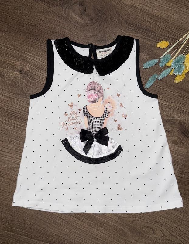 Майка на дівчинку 5/6 років(ми одягали 2 рази в 7років) р.110/116. , комірець обшитий паєтками в ідеальному стані без жодного дефекту Заміри: Довжина - 41 см НОГ - 31 см