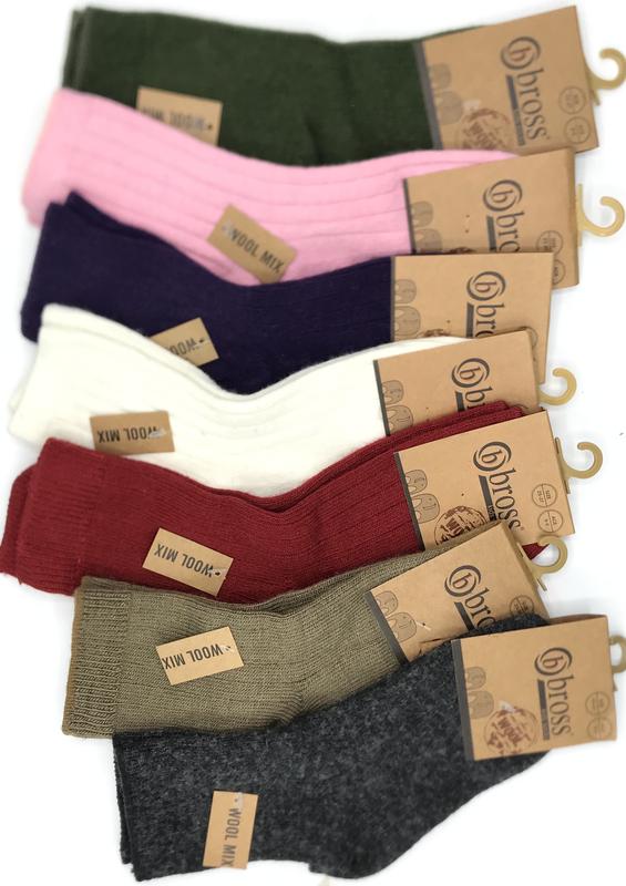 Теплі шкарпетки ТМ «Bross”, Туреччина Склад: 9% вовна, 17% кашемір, 38% поліамід, 35% віскоза, 1% еластан р.25-27: рожевий 1 шт., сірий 1 шт., зелений 1 шт., молочний 2 шт., червоний 3 шт., фіолетовий 2 шт.