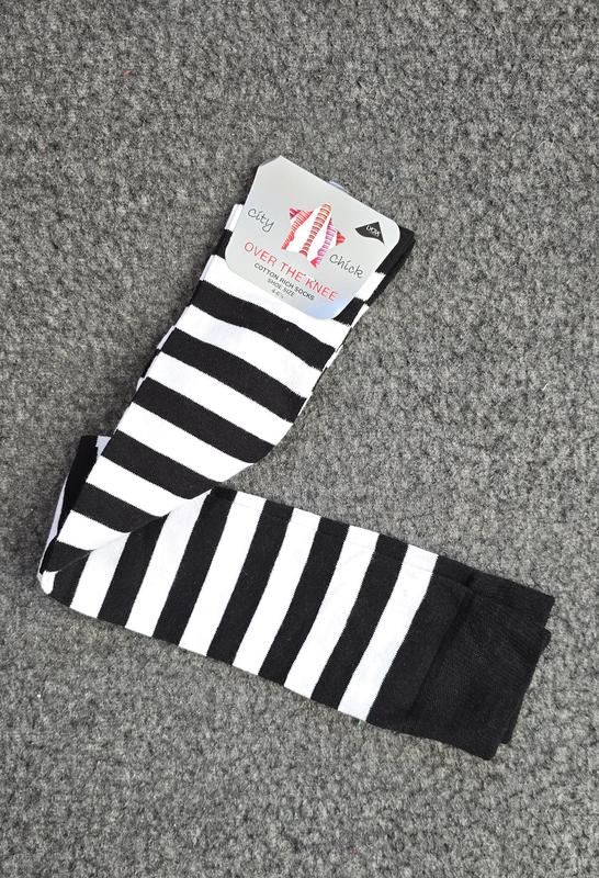 Гольфы зебра выше колена в черно-белую полоску. Материал – хлопок, не капрон. Хорошо тянутся, приятные к телу. Размер один: подходят на стопу от 35 до 41 размера.