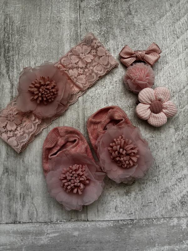 Комплект для маленьких принцесс.Повязка на голову ,носочки и три приколки для волос.