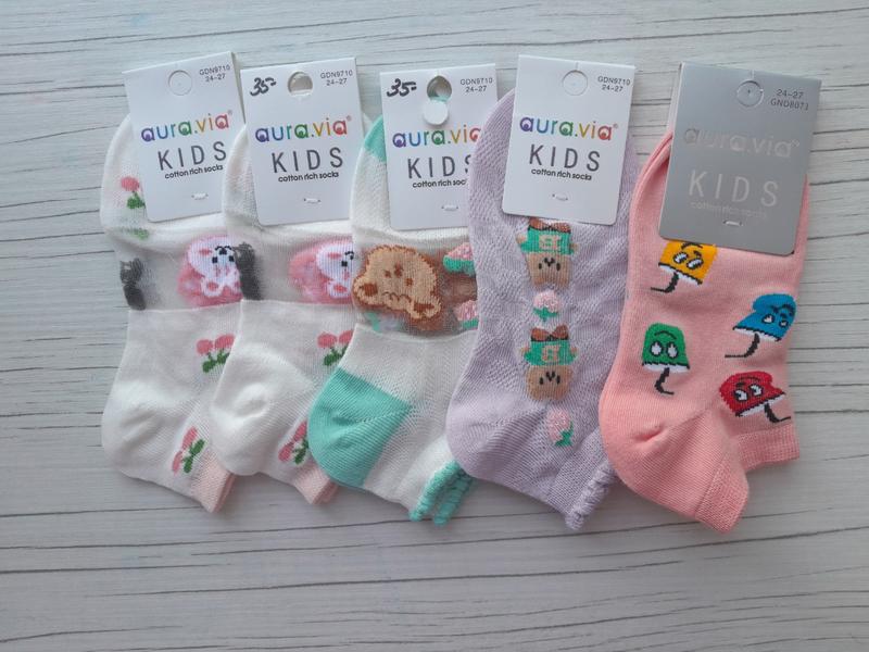 Aura.via. 85% хлопка качественные носки для девочки и мальчика. есть лето тоненькие и есть в сеточку. красивые удобные, красиво носятся! размер 24-27, 28-31, 32-35.