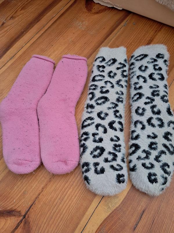 Розовые имеют чугут катышки. А тигровые новые, не одевали совсем, имеют антискользящие наклейки. Цена за две пары