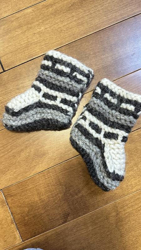 Вʼязані теплі шкарпетки ідеально на холодну пору. Довжина по стопі 14 см. Але це не принципово бо за рахунок висоти вони прекрасно фіксуються і на меншій ніжці