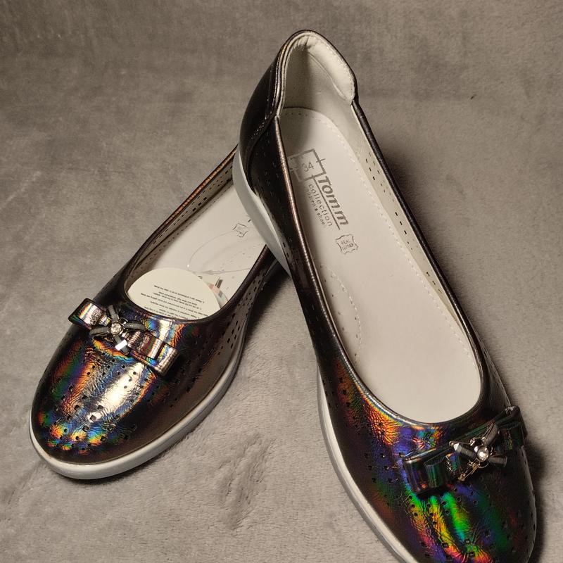 Голографические балетки с бантом и декоративным камешком. Стильные, легкие и удобные.