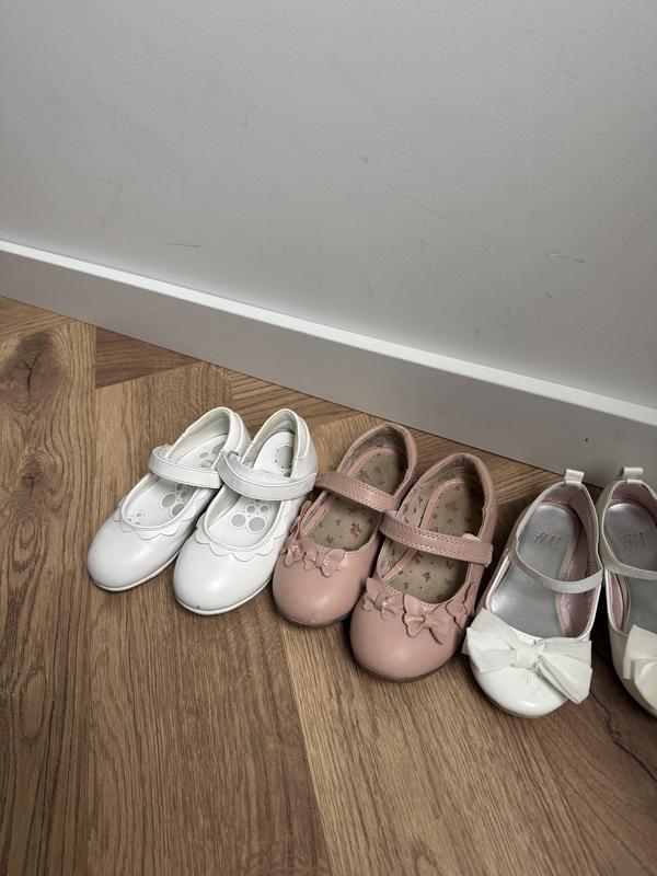 Дитячі святкові туфельки балетки Перша пара біла від chicco повністю шкіряні 25 розмір Є непомітні царапки на носику Ціна 490 грн Друга пара від Next Балетки із штучного матеріалу Неймовірно красиві та стильні 25 розмір 490 грн Білі туфельки з бантиком Від H&M 24 розмір 290 грн