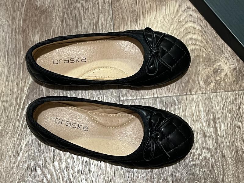 Нові балетки Braska, дитячі, розмір 28 Абсолютно нові стильні балетки бренду Braska. 🖤 Колір: чорний 👟 Матеріал: м’яка екошкіра зі стьобаним візерунком 🎀 Спереду оздоблені акуратним бантиком 👣 Внутрішня устілка з анатомічною підтримкою стопи — комфортна при ходьбі 📏 Розмір: 28 (довжина устілки близько 18 см) Підійдуть як для школи чи садочка, так і на свято. Стан: нові, не взуті.